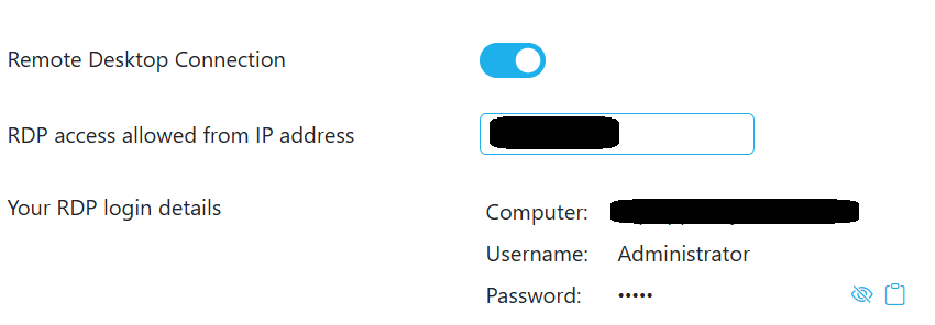 To get the password, go back to your AppOnFly portal, find your RDP login details, and click the copy icon next to the password field.